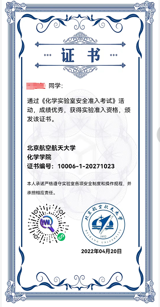 本次活动涉及较为全面的化学实验室安全知识,从进入实验室的个人防护,到对火灾、漏电等突发情况的处理,再到各类危险化学试剂的管理与使用方法,以及实验仪器的安全使用,共分为10个部分向学生提供化学实验室安全教育。其中,每个部分包含若干道安全知识考察题目,全部回答正确能够获得化学实验室安全准入证书,并取得物理化学实验安全准入资格。全面的安全知识,严格的考察题目,更好地提高了学生对于化学实验室安全知识的学习效果。