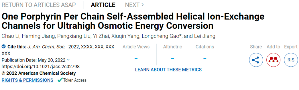 2022年5月20日,Journal of the American Chemical Society 在线发表了网投十大信誉江雷院士、高龙成副教授团队在高效离子交换膜方面的最新研究成果:“One Porphyrin Per Chain Self-Assembled Helical Ion-Exchange Channels for Ultrahigh Osmotic Energy Conversion”。澳门网投十大信誉平台博士生李超为第一作者,高龙成副教授为通讯作者,澳门网投十大信誉平台澳门网投十大信誉平台为第一单位。