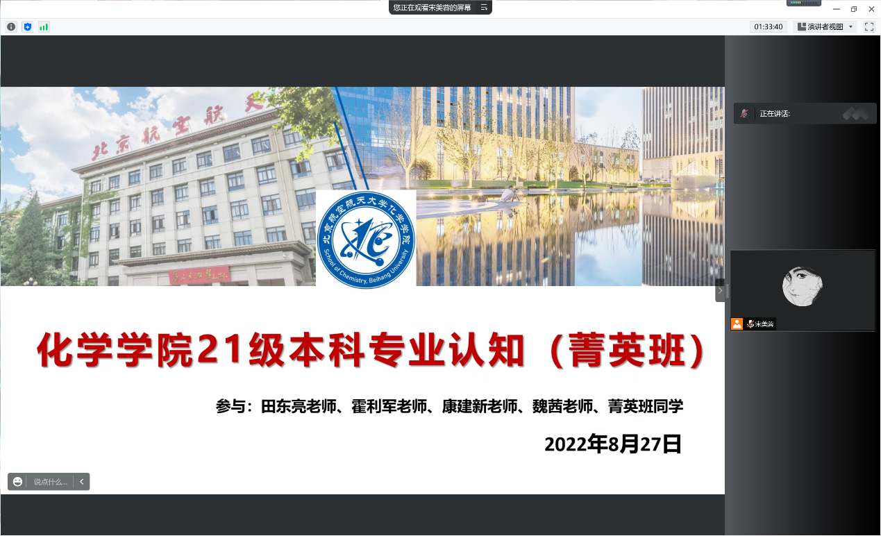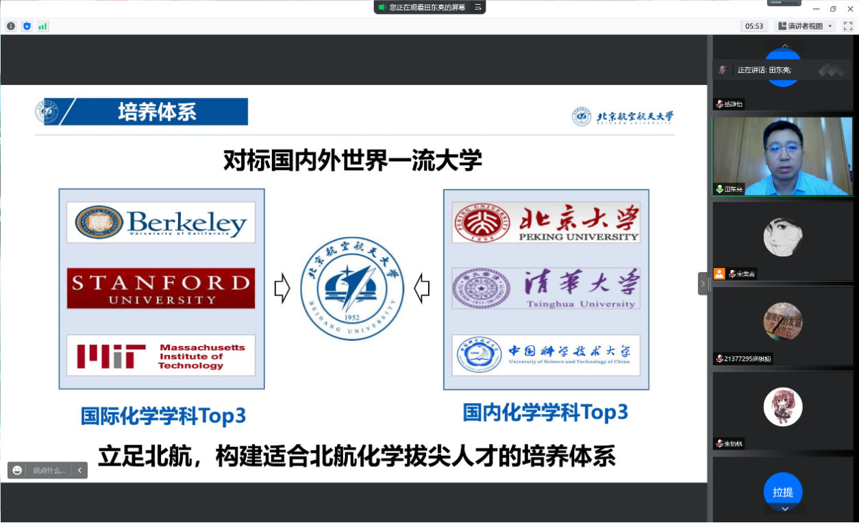 8月28日,澳门网投十大信誉平台2021级菁英班开展系列专业认知教育活动。上午9:00,专业认知大会以腾讯会议的形式召开。本科教学副院长田东亮老师、化学生物学专业负责人霍利军老师、应用化学系康建新老师、院团委书记魏茜老师与菁英班全体同学参加了此次会议。