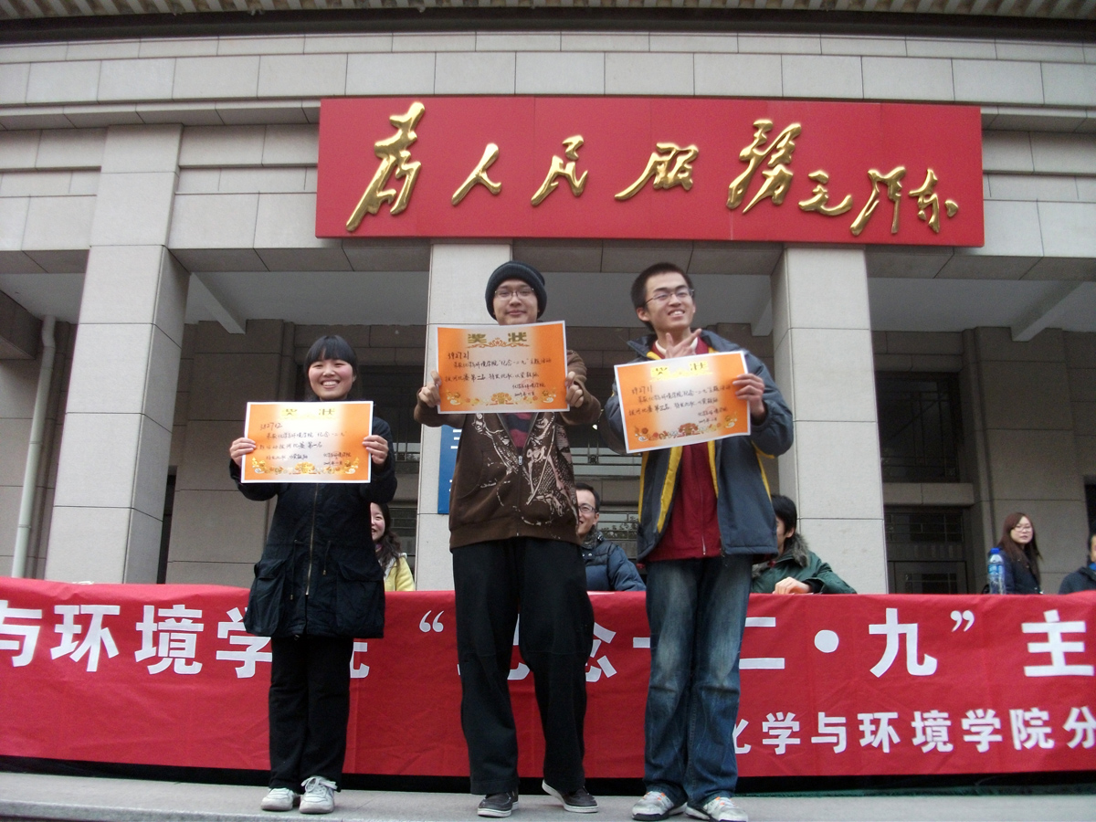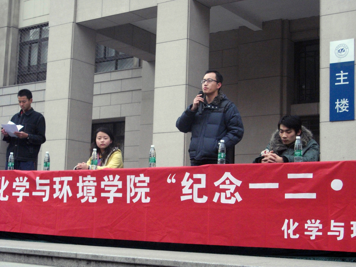 2009年11月29日下午2点,化学与环境学院在主楼前举办一二•九主题纪念活动。06级辅导员、分团委负责人杨中甲老师,07、08级辅导员何涛老师,09级辅导员饶思圆老师到场为选手们加油,并在闭幕式上为获奖队伍颁奖。其中杨中甲老师在开幕式上发表讲话,阐述了本次“纪念一二•九”主题活动的目的与意义。