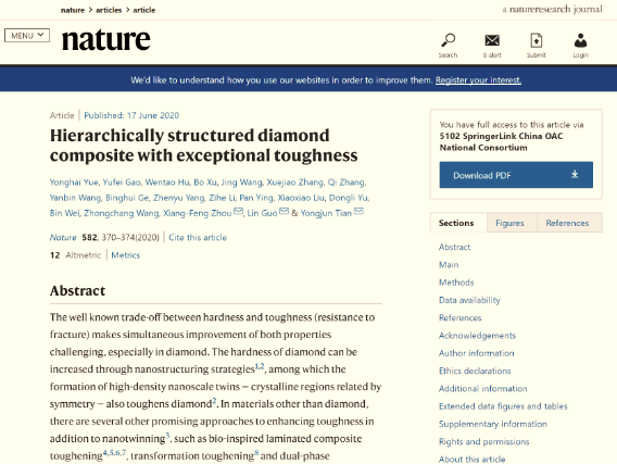 2020年6月18日,Nature杂志在线全文发表了网投十大信誉郭林教授、岳永海教授团队与燕山大学田永君院士团队在纳米孪晶复合金刚石增韧机制方面的最新研究成果:“Hierarchically structured diamond composite with exceptional toughness”。岳永海教授、高宇飞博士、胡文涛教授、徐波教授为文章共同第一作者,周向峰教授、郭林教授、田永君院士为共同通讯作者。