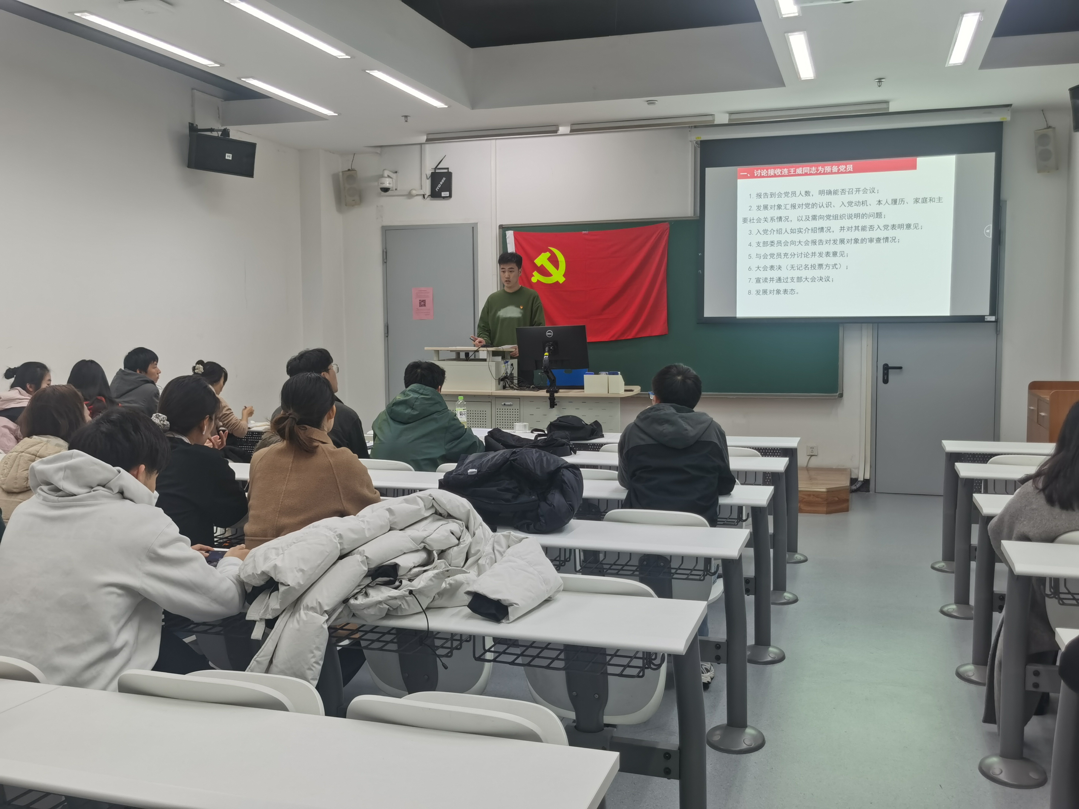 紧接着,按照既定流程,大会正式接收了预备党员连王威同志加入党组织。会上,他分享了他的入党初衷与对未来科研道路的美好憧憬。他承诺,将矢志不渝地践行入党誓词,将个人成长融入国家发展的伟大事业中,努力在科研创新和社会服务中发挥积极作用。老党员卢洪来、陈奕帆两位同志结合自身经历,讲述了如何在科研中贯彻党的方针政策,并对新党员提出了宝贵的建议与期望。在此庄严时刻,全体党员与连王威同志一同重温入党誓词,再次深刻体会了党员身份的神圣与责任。