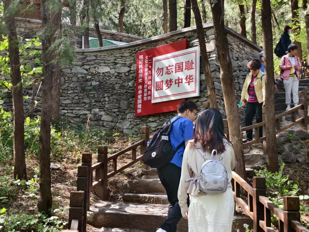 支部党员沿樱桃沟步道攀登至纪念地。行至半途,“勿忘国耻,圆梦中华”的鲜红标语赫然映入眼帘,字字铿锵有力,仿佛跨越时空的呐喊,将抗战精神与新时代青年使命紧密相连。在庄严肃穆的“一二·九运动纪念亭”前,支部书记陈喆为支部党员讲述了“一二·九”运动时期的革命历史和意义。同学们结合展板图文,深刻学习了“一二·九”运动中爱国学生冲破封锁、唤起民众觉醒的历史细节。同学们长久驻足,透过泛黄的历史照片和详实文献,追忆北平学生抗日救国示威游行的壮烈场景。党员王力宏感慨:“题展里郭明秋等革命前辈组织领导爱国学生运动的事迹,让我深刻体会到战争年代,青年学子抛头颅洒热血;当代青年与新时代同向同行,肩负民族复兴重任,我们应牢记嘱托实干笃行,牢记科技强国使命。”党支部书记陈喆表示:“作为理工科研究生,我们既要传承‘科学救国’的历史基因,更要培育‘科技报国’的时代担当。”