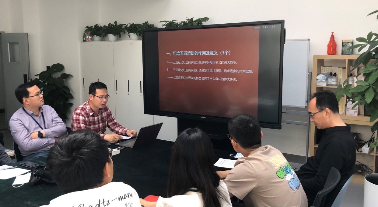 首先,副书记张绍丽领学《习近平在清华大学考察时强调坚持中国特色世界一流大学建设目标方向为服务国家富强民族复兴人民幸福贡献力量》和《在纪念五四运动100周年大会上的讲话》。他表示,青年要立大志、明大德、成大才、担大任。并以总书记对青年学子十六字寄语互相勉励各位:爱国爱民、锤炼品德;勇于创新、实学实干!