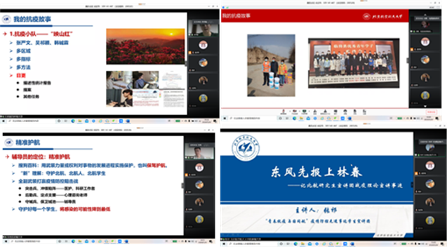 吴祁颖同学讲述了他同两名小伙伴成立“映山红”防疫小分队,利用专业知识监控全国(除湖北)地区的疫情发展情况,通过分析撰写提案,其主笔撰写的提案被民建中央综合采用。他提出能够运用统计学的知识实现抗疫,他很自豪。他强调“上医治国,中医治病,下医治人。”他是学以致用的榜样,充分体现了用专业知识为国家为人民作贡献的青年担当,身体践行了科研报国的北航情怀。